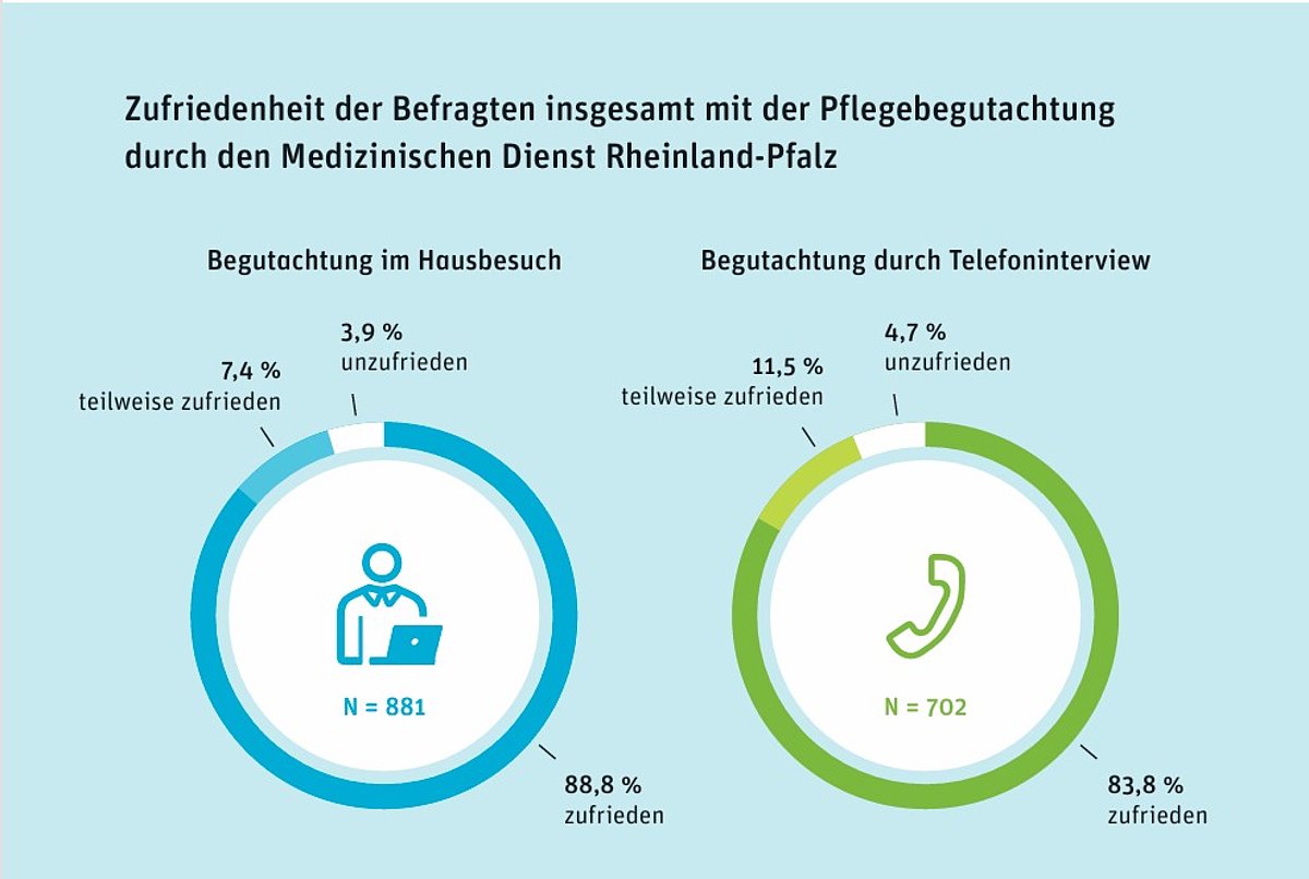Die Ergebnisse der repräsentativen Versichertenbefragung zur Pflegebegutachtung 2025 finden Sie auf der Webseite des Medizinischen Dienstes Rheinland-Pfalz unter Versichertenbefragung Pflegebegutachtung | Medizinischer Dienst Rheinland-Pfalz (md-rlp.de)